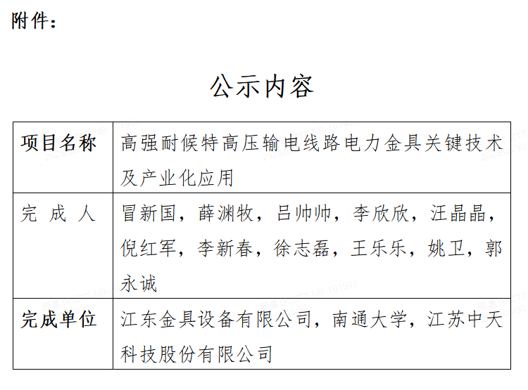 根据《省科技厅关于2024年度江苏省科学技术奖提名工作的通知》(苏科资发(2025〕90号)要求,现对我司拟参与提名项目“高强耐候特高压输电线路电力金具关键技术及产业化应用”信息予以公示,详见附件。